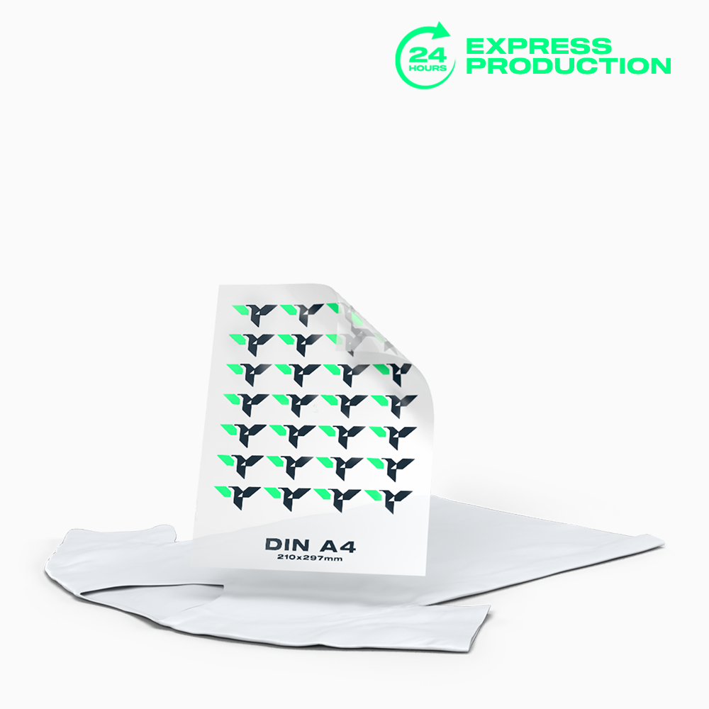 Quick as a flash, but please do it quickly. I need the prints quickly. Then use our express production. Within 24 hours we have everything printed on foil and shipped. You then decide whether express delivery is also necessary. With the fixed DIN A4 210 x 297 mm format, you can, for example, without much cutting suitable motifs directly. There’s no faster way to process them.